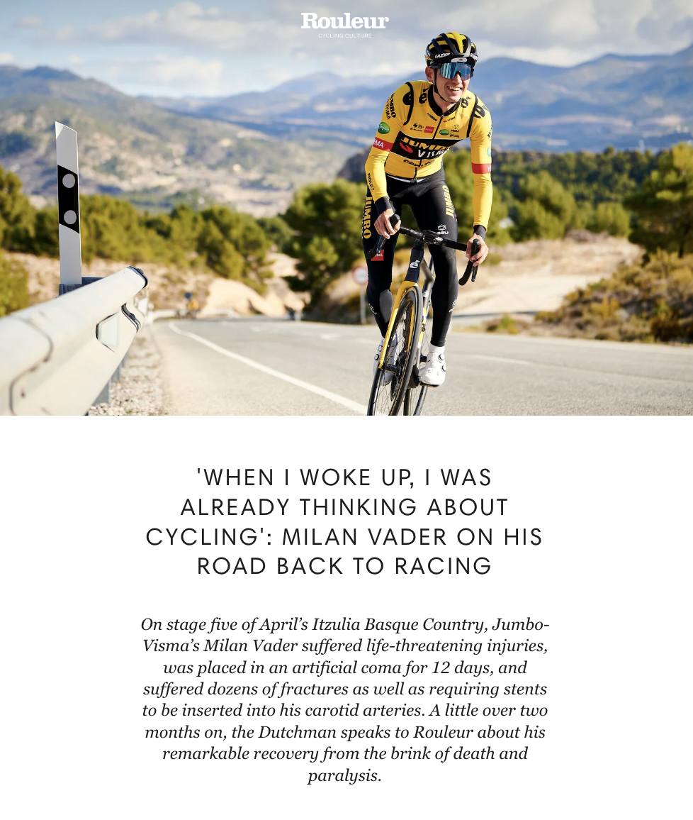 We’ve been talking for close to half-an-hour, and I’ve been astounded – inspired, even – by Milan Vader’s positivity. Ten weeks ago, just a few hours after I’d last seen him smiling and laughing as he went to sign-on at stage five of the Itzulia Basque Country, the Dutchman crashed hard and almost lost his life. It’s when he addresses the reality of what occurred that there is a noticeable shift in his cheery voice. “I feel really lucky,” he speaks slowly. “There were a few moments that I could have been dead.” He pauses. “I am very lucky.”