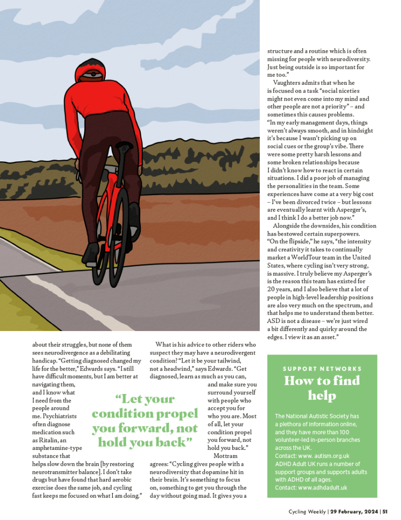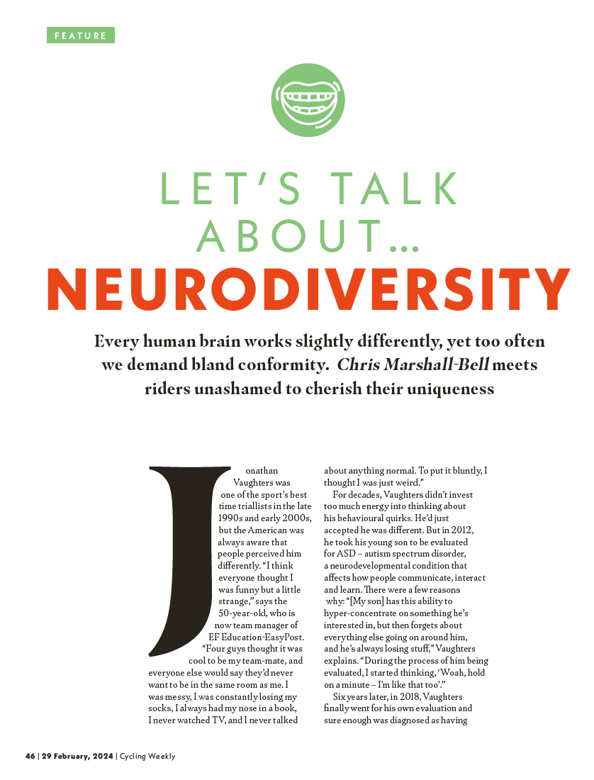 Vaughters isn’t the only high-profile retired cyclist with a neurodivergent condition: both three-time Tour de France winner Greg LeMond and Germany’s last winner of the race, Jan Ullrich, have ADHD – attention deficit hyperactivity disorder – and it is thought that between 3-5% of the world’s population do, too. According to one 2021 study, neurodiversity in cycling is “undertreated”, and as many as one in seven cyclists might be neurodivergent. “Why,” though, bemoans Vaughters, “is it something that isn’t widely talked about?” He points out that, to the best of his knowledge, the only well-known figures in pro cycling who are openly neurodivergent are himself and the two mentioned above.