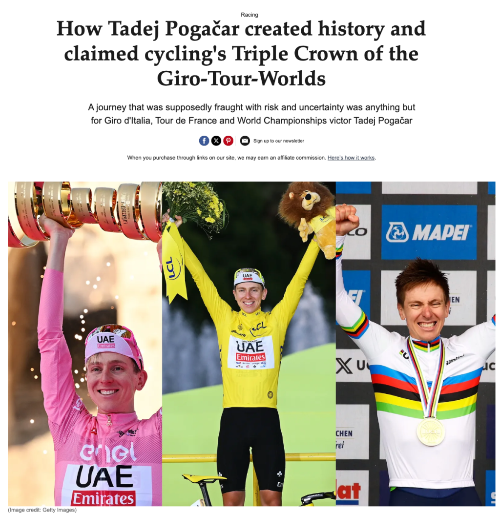 It all started in the back of a taxi in December for Tadej Pogačar with a cheeky ‘andiamo’ – let’s go. The genesis of a journey of 7,088km, 101,400 metres of elevation gain, 13 summit finishes, four time trials, 39 days as leader, 12 (twelve) victorious stages, wind, rain, snow, roasting heat, bottles gifted to fans, glasses and jerseys given to fellow riders, and a successful attempt at doing what many greats have tried and failed, and only Eddy Merckx and Stephen Roche have done, but no-one since 1987: the Triple Crown of the Giro d’Italia, Tour de France and World Championships.