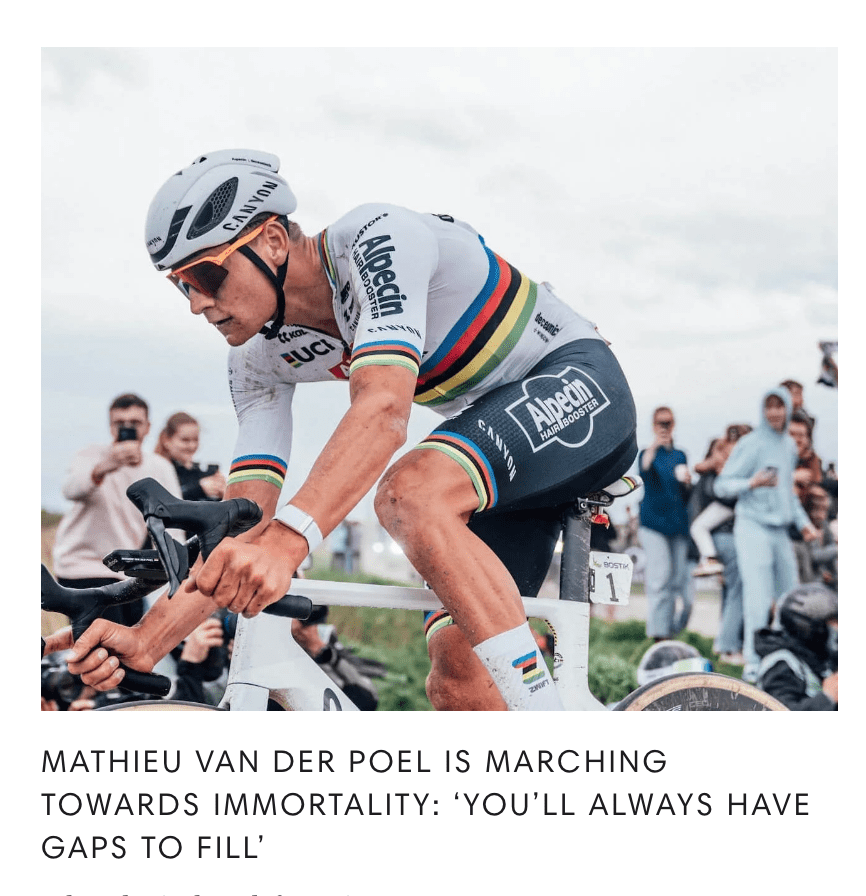 When you’re chasing a third successive Paris-Roubaix title, have won all the spring Classics – cobbled, Ardennes and Italian – except two (Gent-Wevelgem, 2nd – 2024; and Liège-Bastogne-Liège, 3rd – 2024), and have already settled the everlasting debate of who’s better between yourself and your great rival – six Monuments to one; nine world titles to three – what else is there really left to win? You’ve worn the yellow jersey of the Tour de France, secured GOAT status in one discipline (cyclo-cross) by ruthlessly and relentlessly laying waste to your opponents for the past decade, and latterly ruled a new discipline (gravel) because you own the patent to all bikes – past, present and future – and no one else is allowed to share equal pleasure, how on earth can you improve your palmarès?