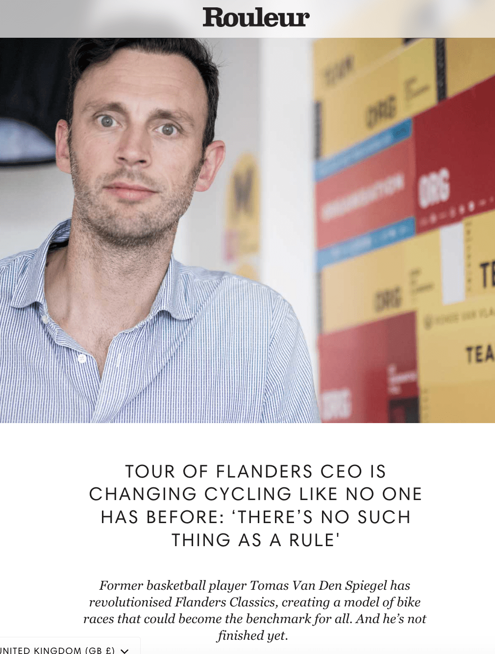 The media can rightfully be accused of hyperbole and overstating a person’s stock, but you cannot understate the importance and growing power of Tomas Van Den Spiegel within cycling. A professional basketball player for 18 years in six countries, Van Den Spiegel has been the CEO of Flanders Classics since 2018, turning it into the most modern, innovative and progressive race organiser in the sport, while simultaneously being unafraid of deviating from convention. With an instrumental role in the proposed One Cycling project, he is eyeing even more influence in the coming years.